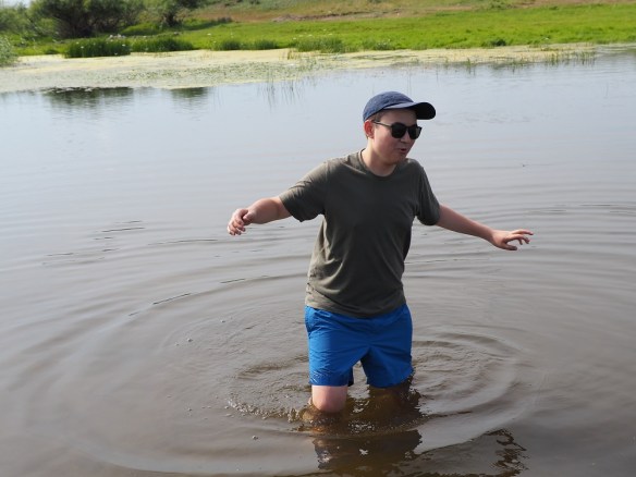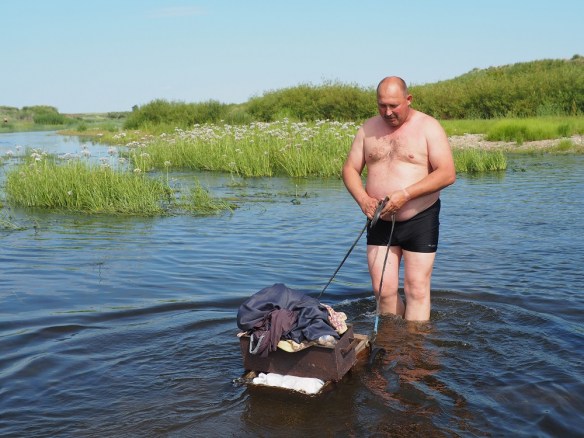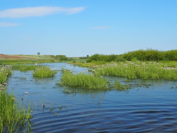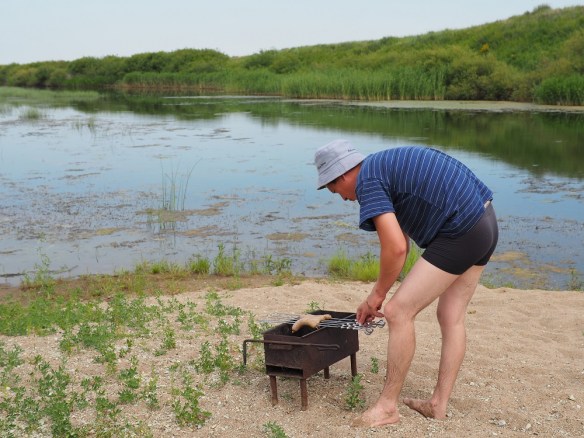 Nach drei Stunden marschieren wir wieder bis 7 Uhr abends durch die Steppe. Eigentlich wollen wir am Fluss entlang gehen, auch weil wir vorhaben, mal kurz hinein zu springen. Doch da haben wir die Rechnung ohne die Schafe gemacht. Also wieder über harte Grasbüschel und viele Erdhügel mitten hinein ins Steppenland.