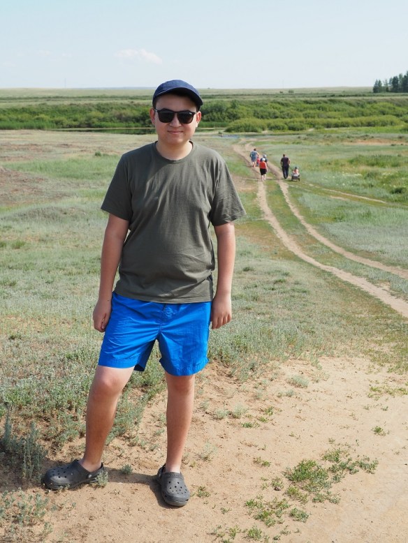 Nach einem 20 Minuten Marsch ruhen wir uns kurz aus. Denn die Tiere immer zusammenzuhalten, und das ohne Hund, ist ganz schön stressig. Jetzt wartete auf mich die eigentliche Überraschung: Tanat stellte mir das WLAN ein! (Echtes WLAN, denn ich habe keine kasachische Telefonkarte für mobile Daten.) Warum es in den Weiten der Steppe Internet gibt, bleibt sein Geheimnis. Aber es klappte.